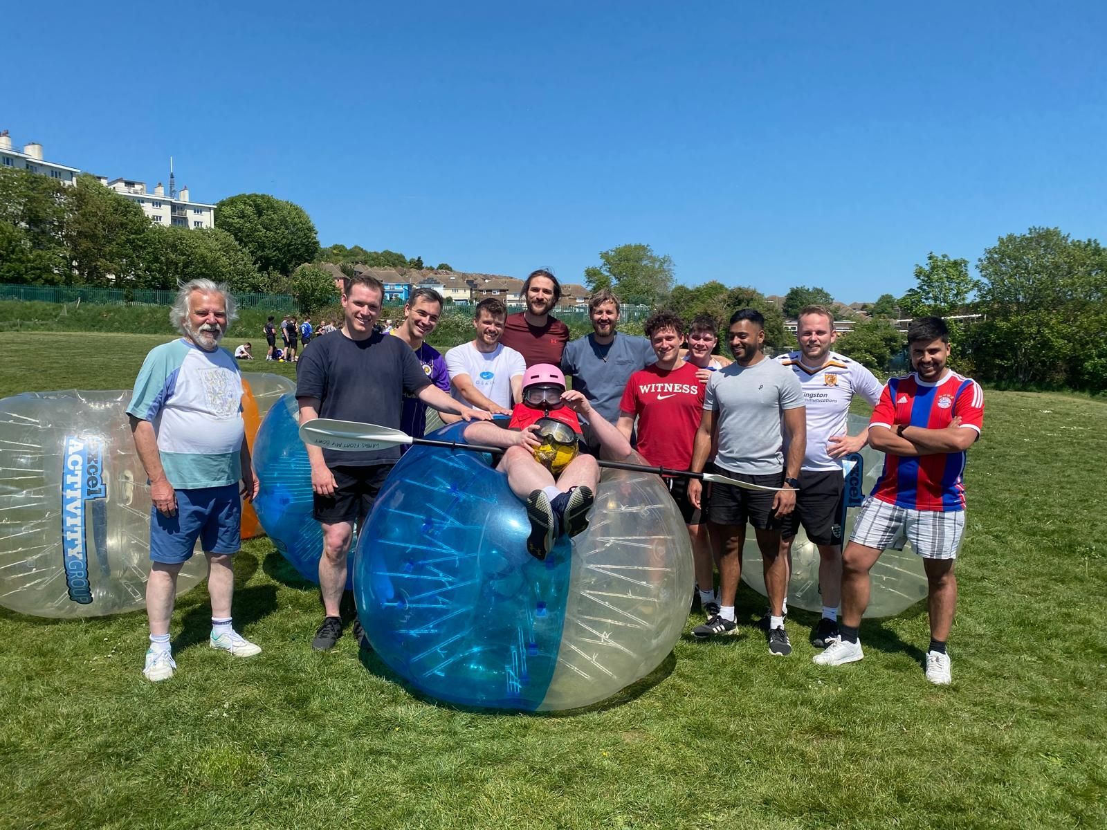 Zorbing Football, also known as bubble football, is a sport where players wear inflatable, transparent zorbing balls around their upper body. The aim is to play Football while encased in these giant bubbles, adding a fun and challenging element to the game as players bounce, collide, and roll around. It's a unique and entertaining twist on traditional football and just as fun for spectators alike.
